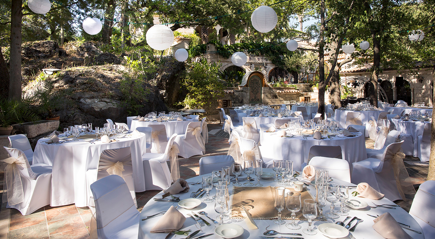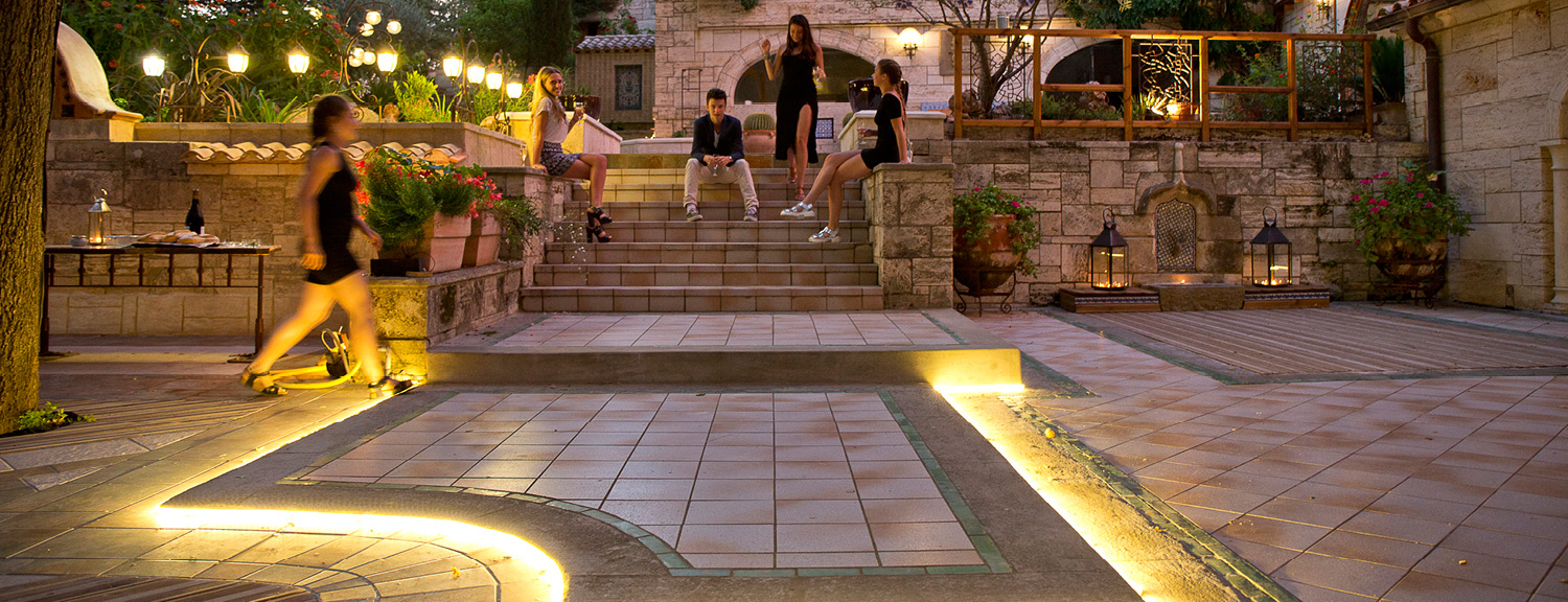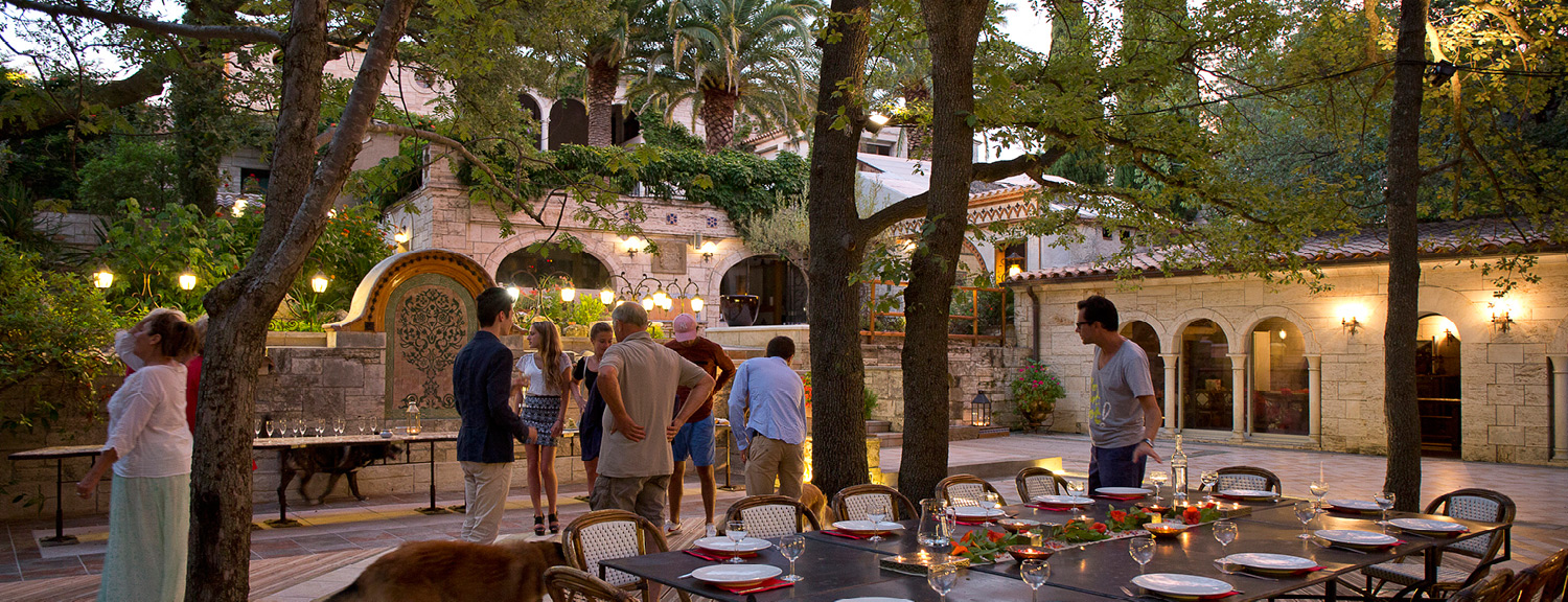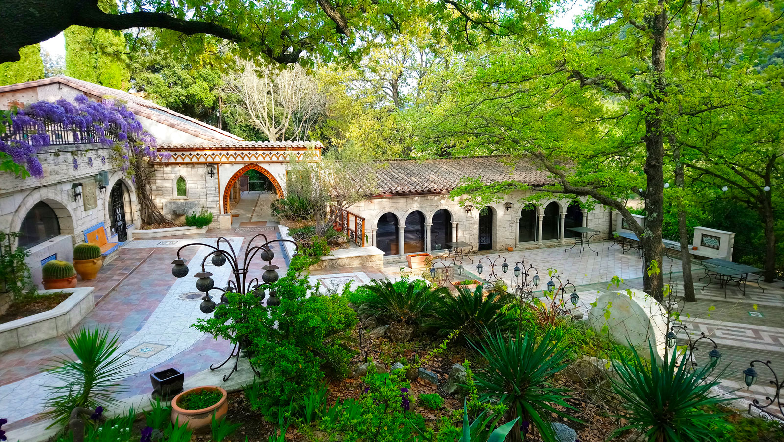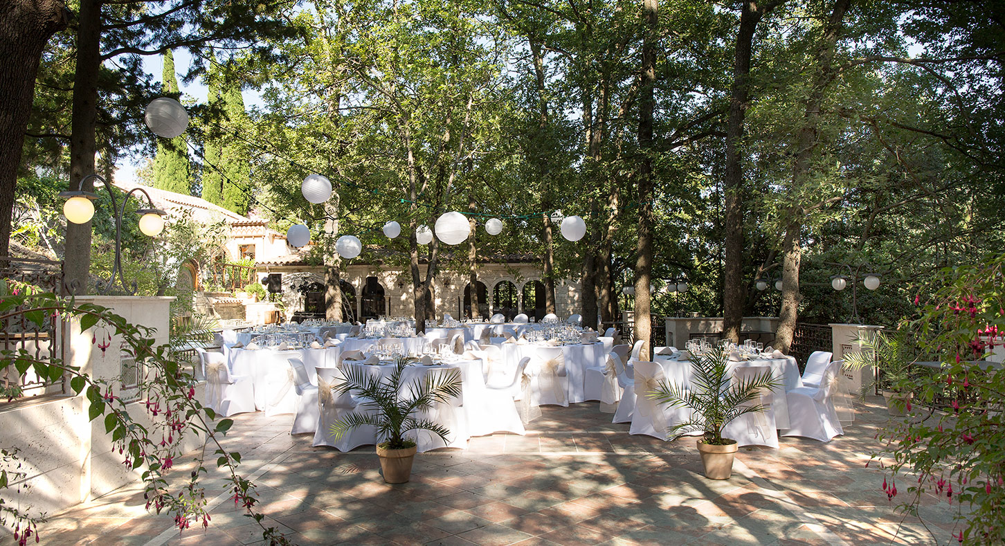 Pour un buffet à la belle saison, une animation conviviale, un repas de famille, la terrasse peut accueillir de grands groupes pour manger ou travailler en extérieur, et profiter du cadre naturel et architectural. Pour animation musicale, un orchestre trouvera naturellement sa place dans un espace dédié, près du cloître.